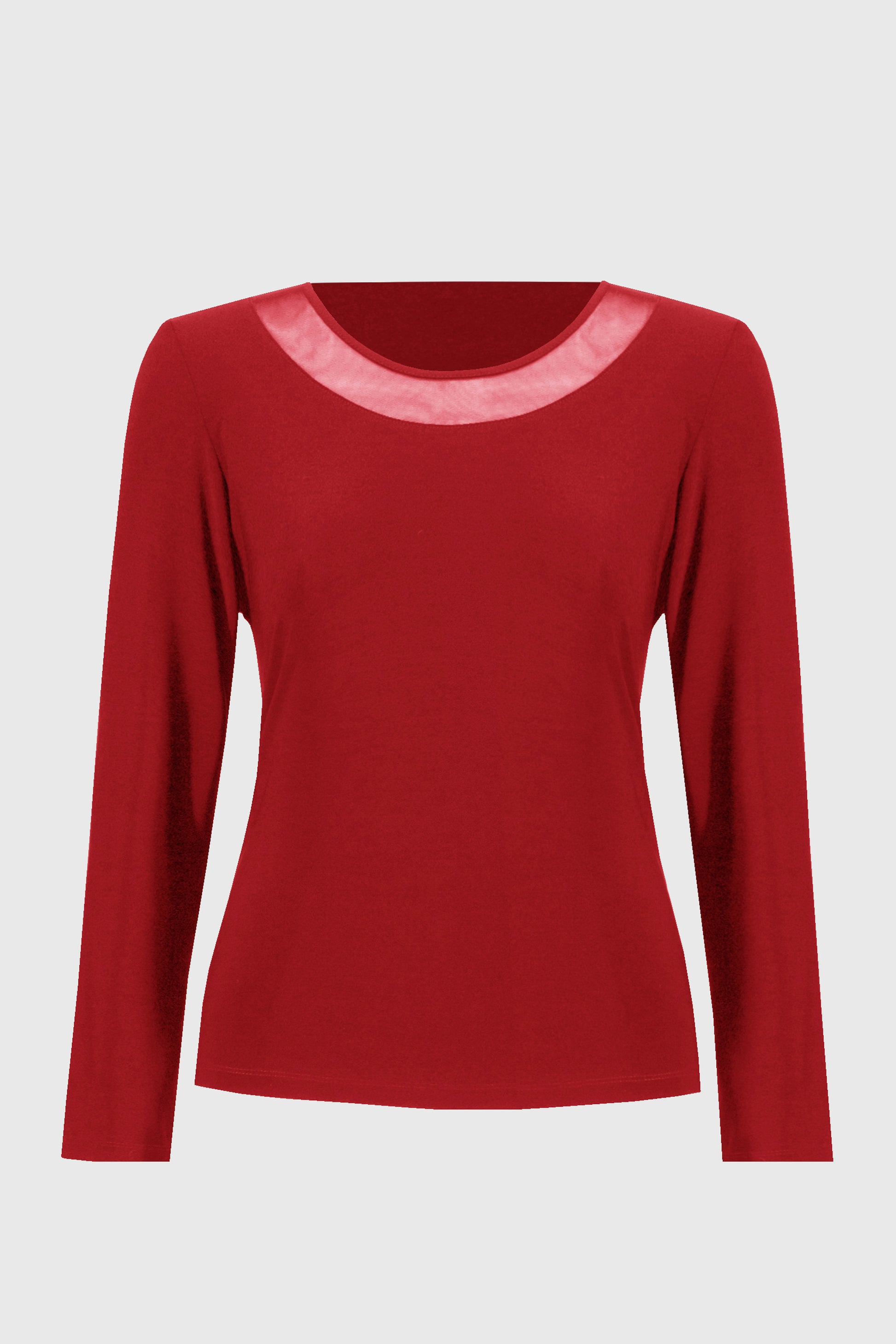Indulge in effortless elegance in this silky knit top. The modern design features a chic scoop neckline accentuated by a beautiful mesh neckband. The fitted garment creates a flattering silhouette that exudes poise and elevates any attire.