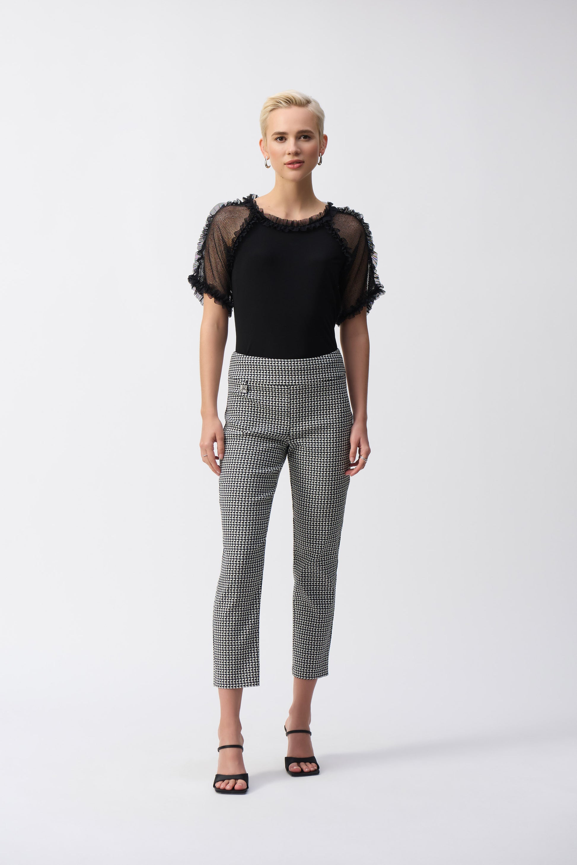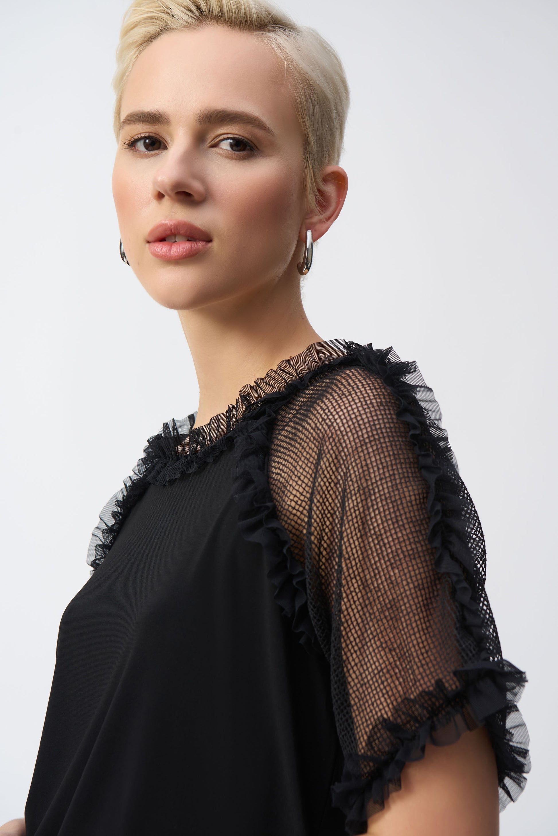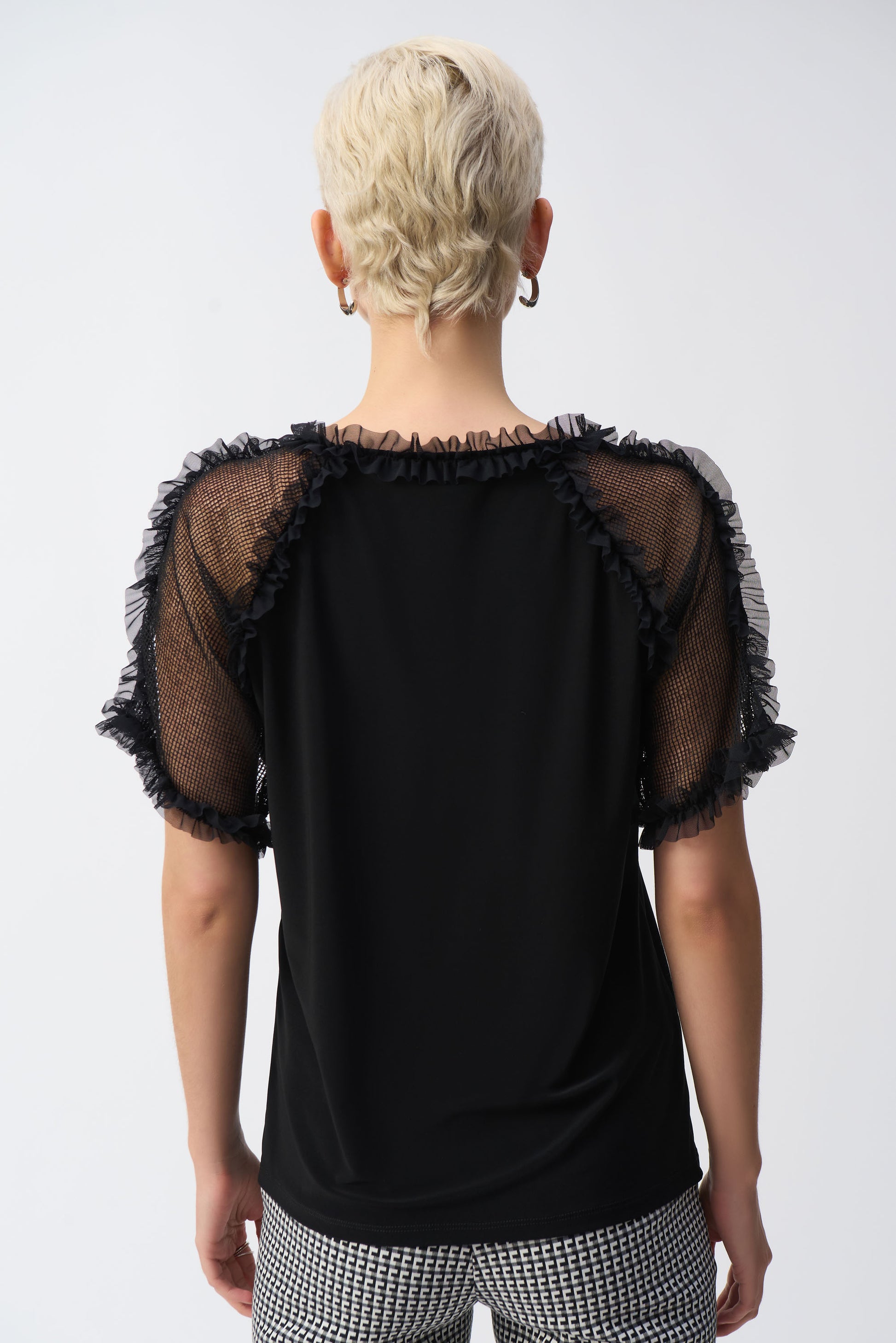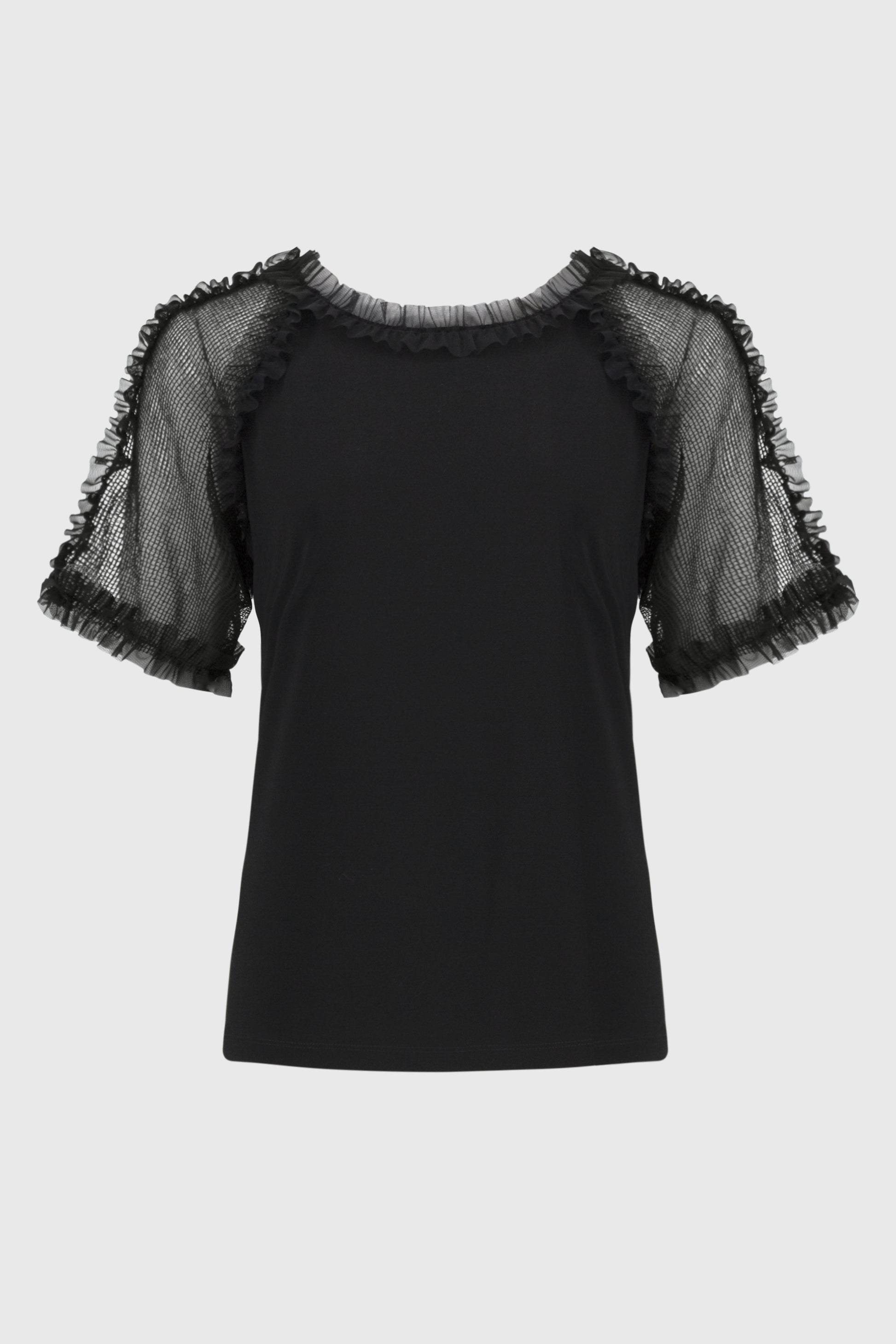 Incorporate casual elegance into your everyday style with this lovely silky knit top. The sleek crew neck and mesh raglan sleeves lend a bold feel to the garment. A beautiful frill trim adorns the neckline and sleeves adding extra flair to this unique contemporary design.