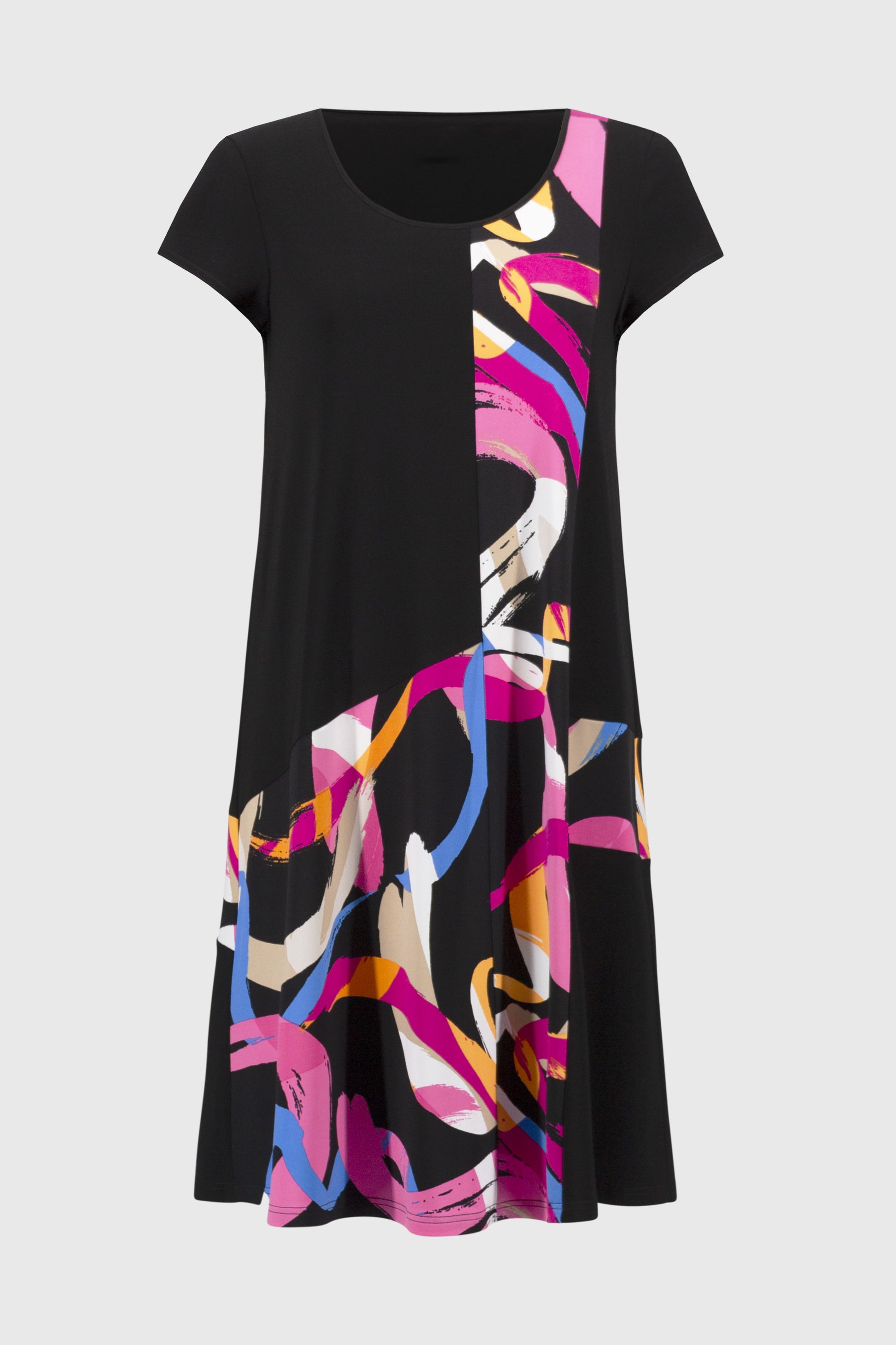 This knit dress effortlessly blends classic allure and modern flair. A beautiful abstract print adorns the fabric, adding undeniable character to the garment. The scoop neckline exudes understated elegance while the trapeze silhouette with colour-blocked inserts creates a polished look.
