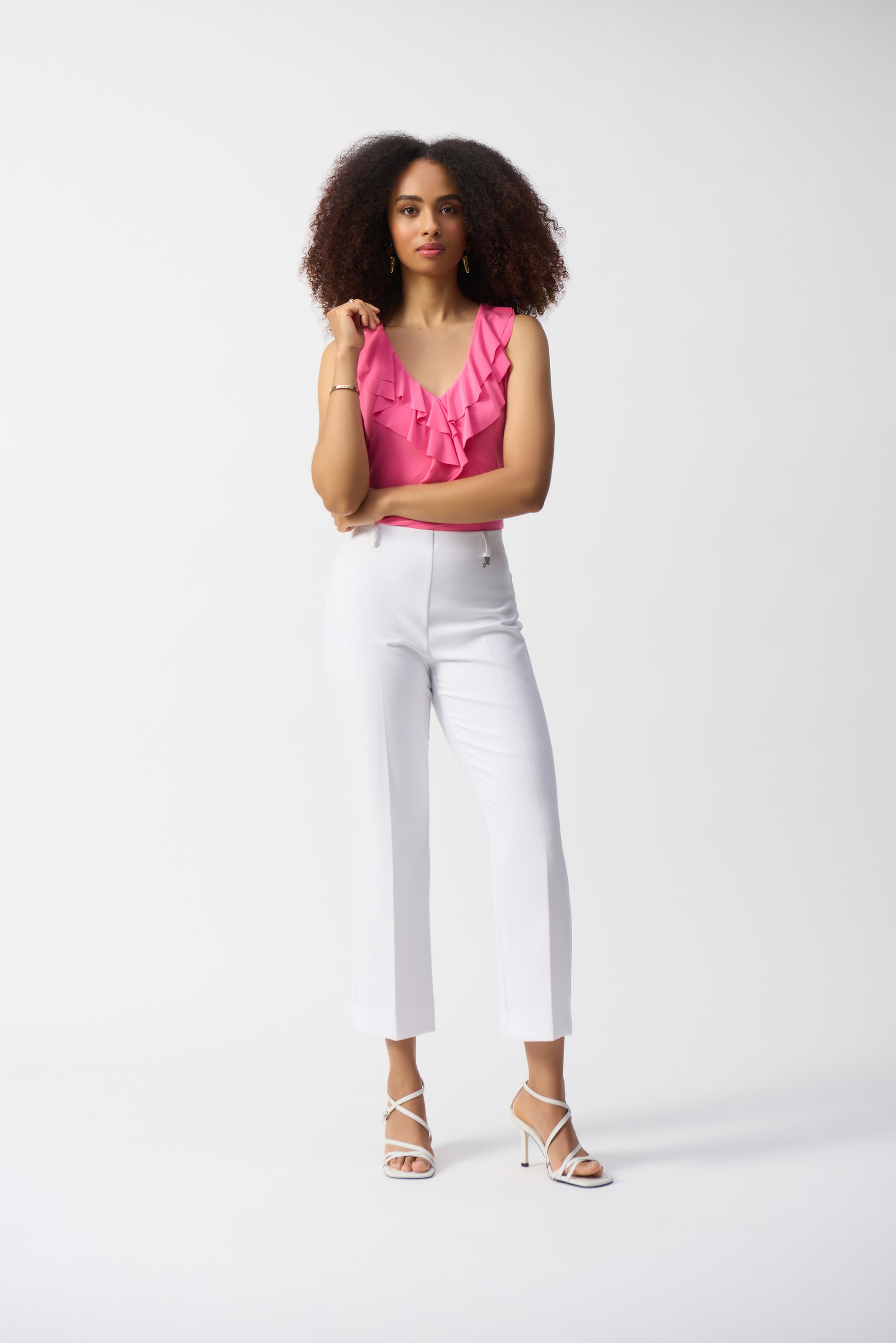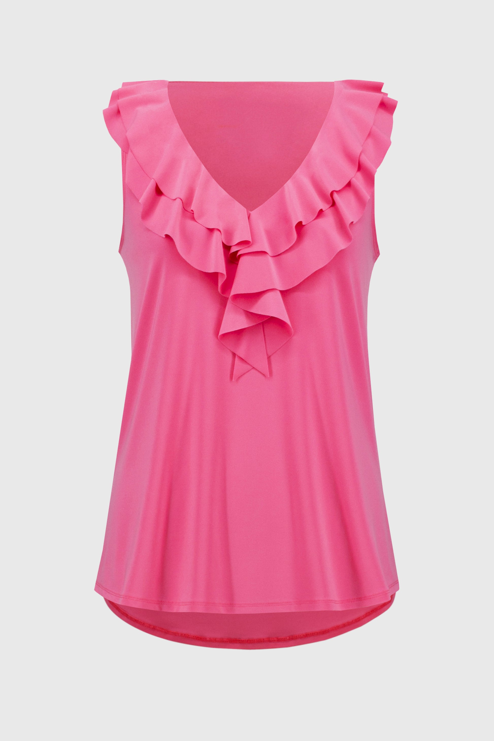 Feminine ruffles cascade down a v-neckline in this lovely sleeveless tunic. A straight silhouette and tunic length give this piece a relaxed yet refined look that can be worn effortlessly with slim leg pants.