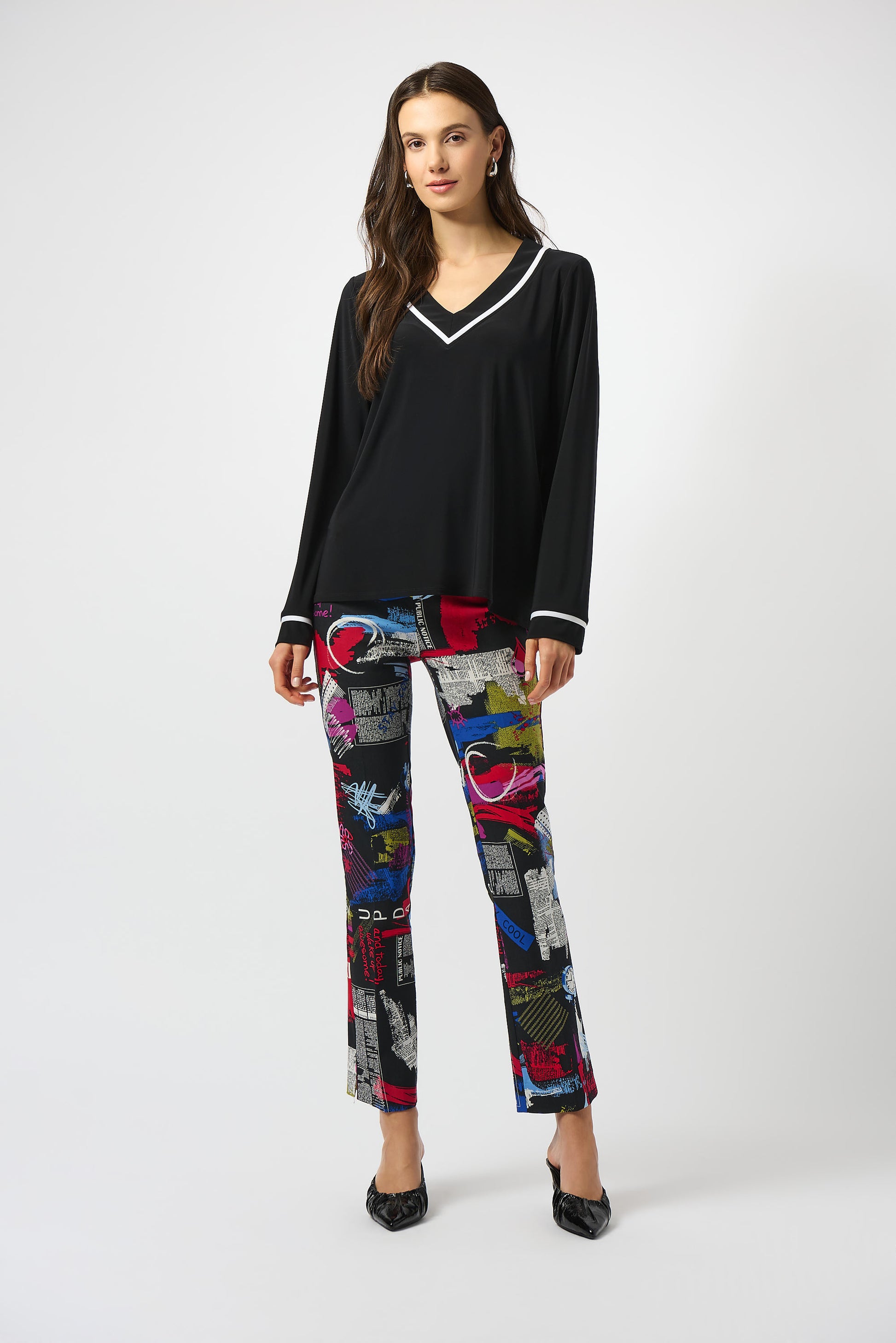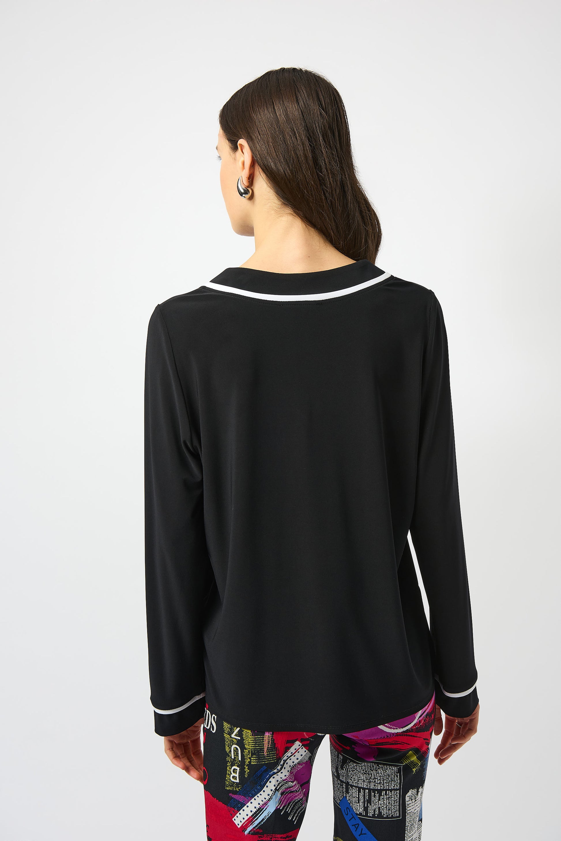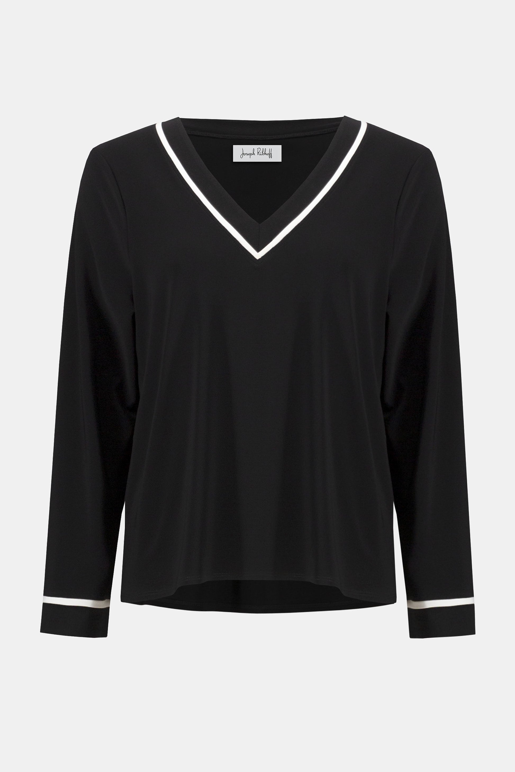 This contemporary top, crafted from a chic silky knit fabric, exemplifies effortless style. A wide V-shaped neckline and classic long sleeves beautifully complement the garment’s polished look. The piece highlights lovely neck and cuff trims in contrasting colors, adding character to the elegant straight silhouette.