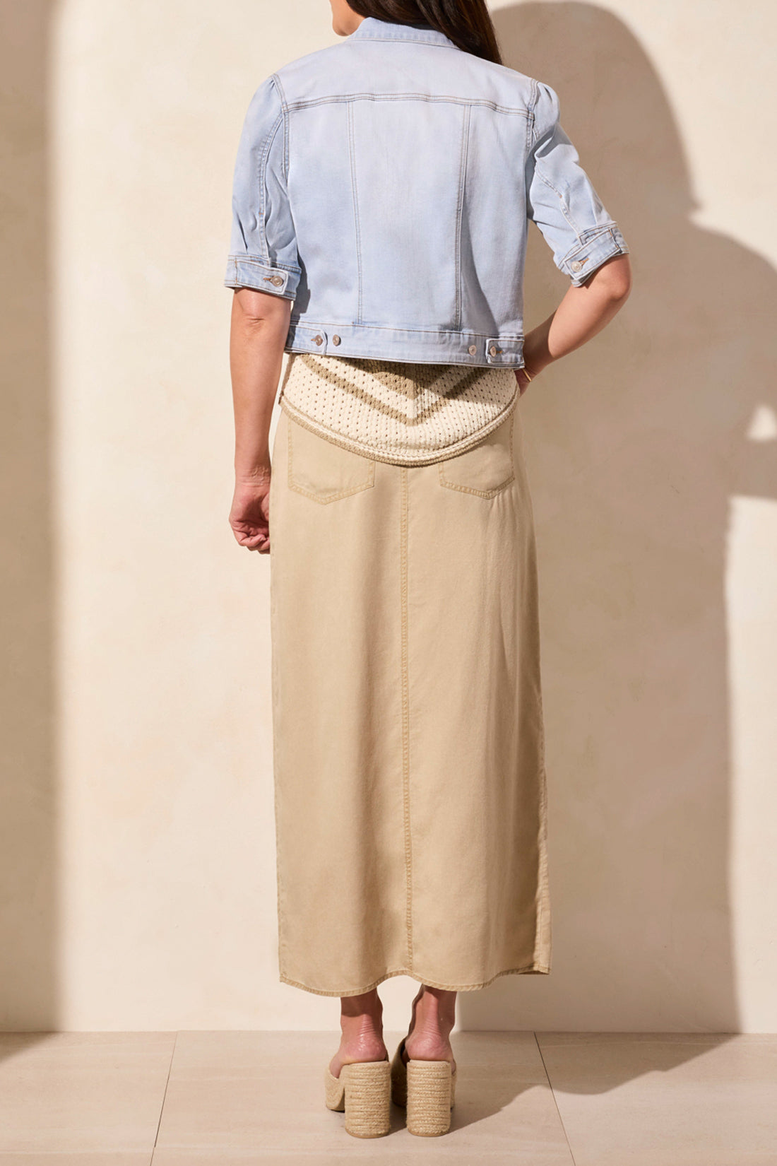 Complete your ensemble with this button-up denim jacket, featuring stylish elbow-length sleeves. Chest pockets and a tailored collar add classic structure to this timeless piece. The cropped length provides a contemporary twist, while the stretch denim ensures all-day comfort.