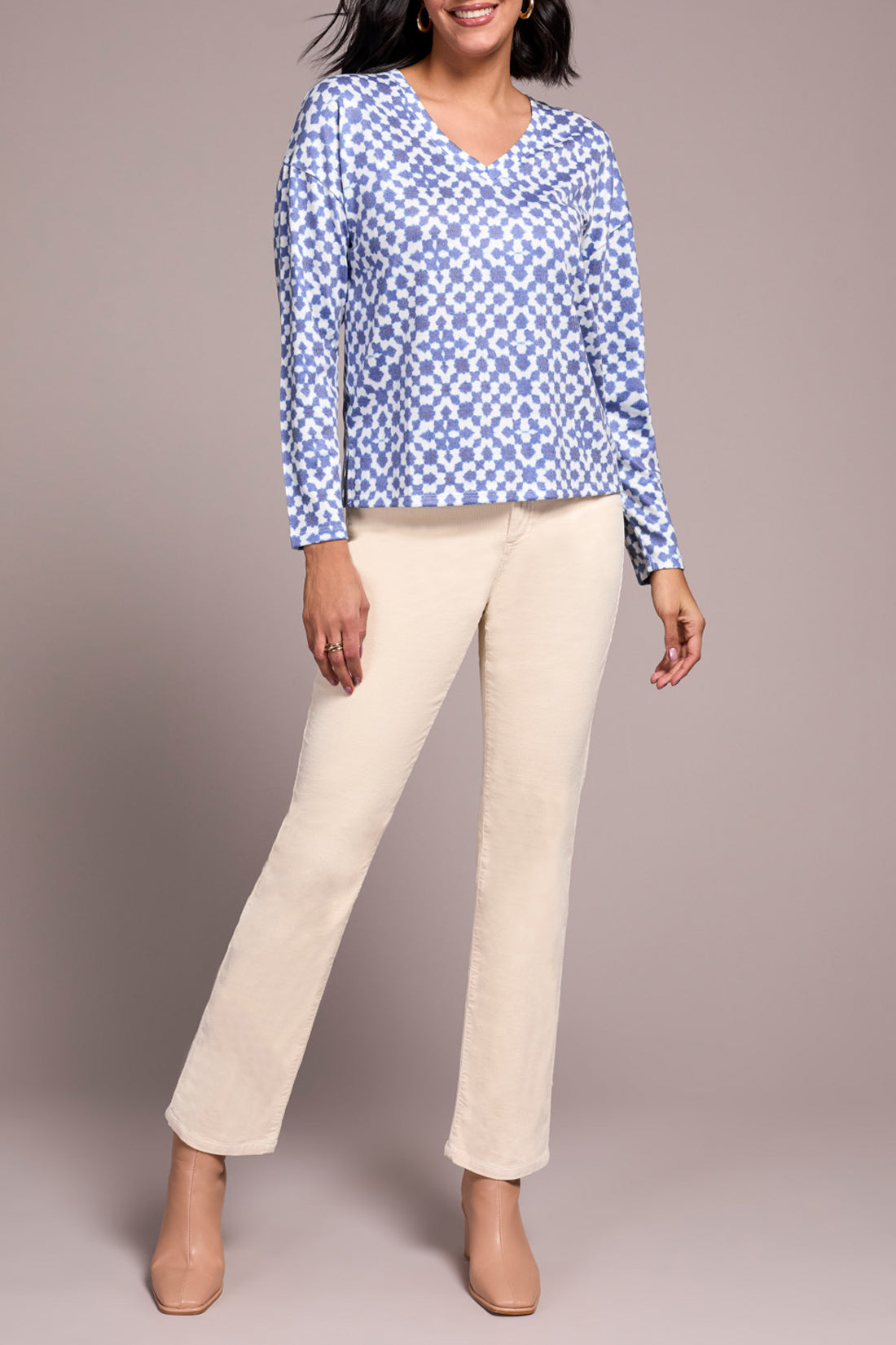 Stay cozy and stylish in this long-sleeve top, crafted from a fuzzy soft knit perfect for cooler days. The v-neckline frames your face with flattering structure, while the bold pattern, featured in a statement design, captures attention. Side slits at the hem offer a touch of ventilation and effortless movement, ensuring comfort throughout the day.