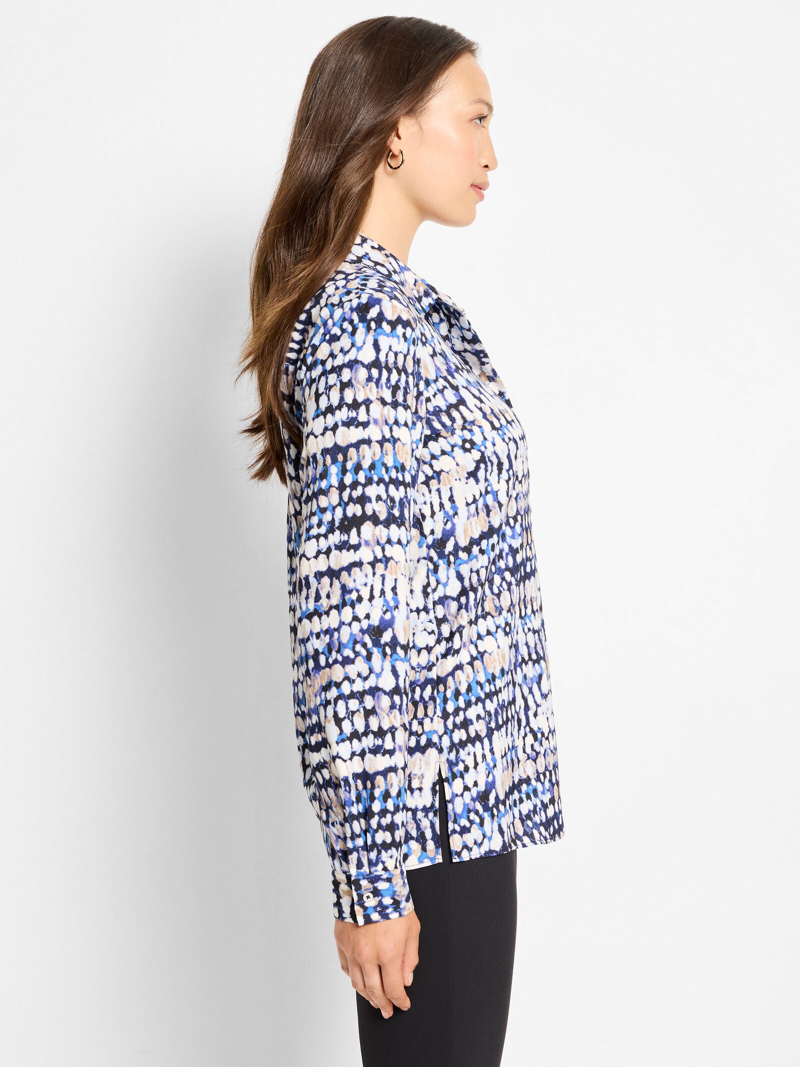 The Harvest Dot print gets an update, going blue for its latest iteration. This top features a regular fit that flatters, complemented by a traditional shirt collar and long sleeves for a sophisticated look. The basic sleeve design and button front add a touch of elegance, making it perfect for both casual and formal occasions: work ready or destined for denim. Sitting slightly below the hip, she provides a comfortable and flattering silhouette for any season/reason.