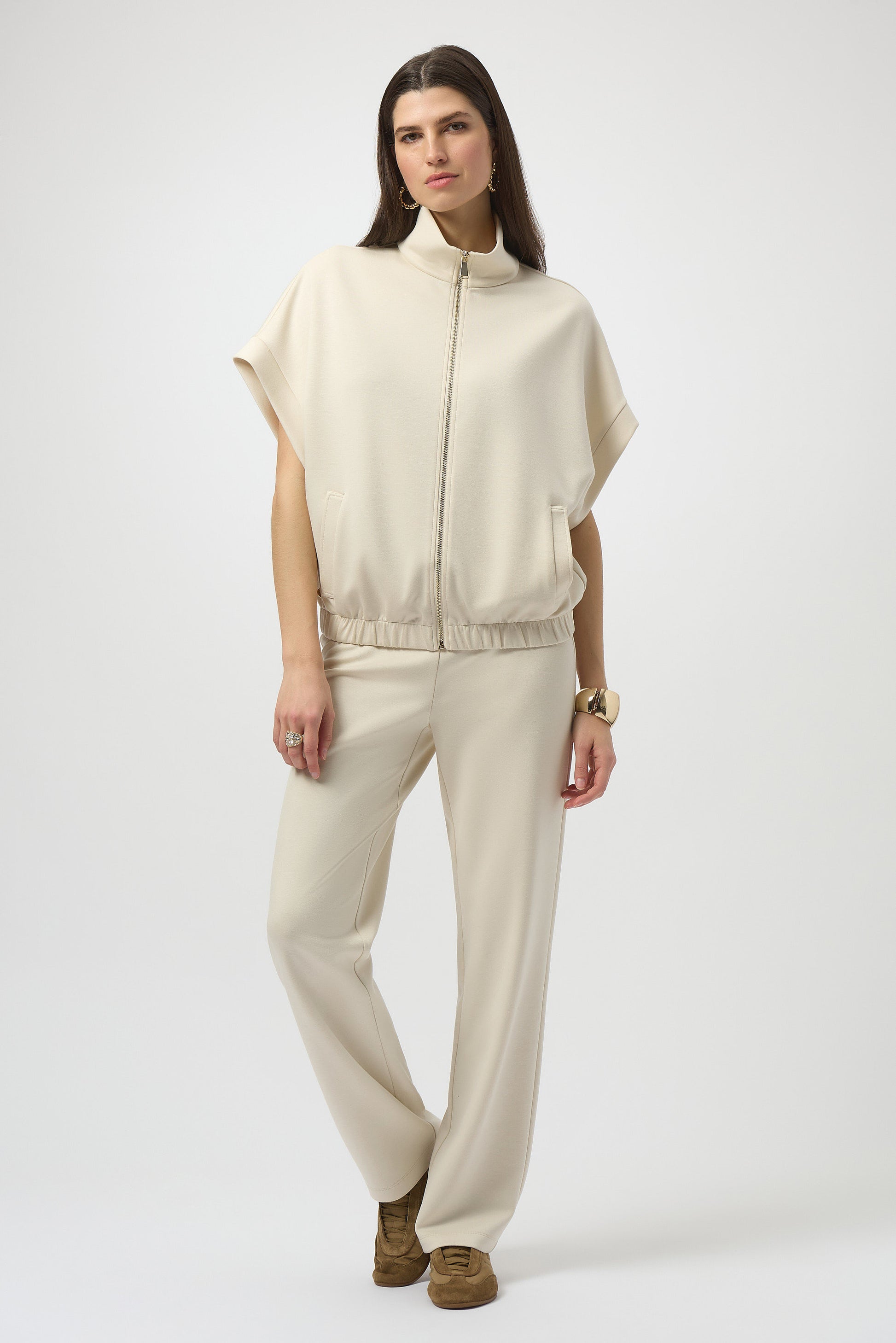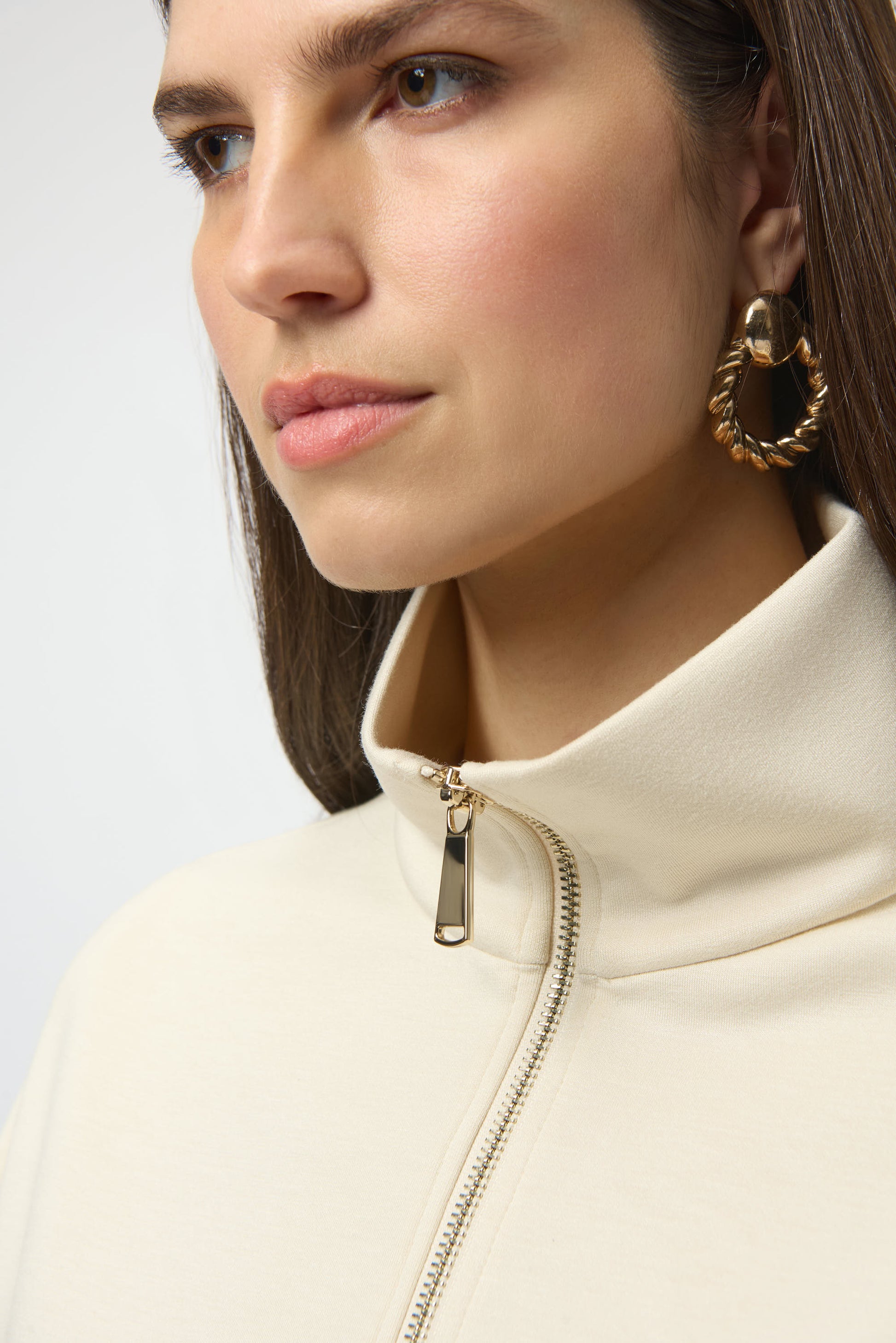 Designed in a bold boxy silhouette, this scuba jersey jacket brings modern flair with its chic stand collar and front zipper closure. The elegant welt pockets and delicate JR coin ornament add a distinctive touch to the garment.