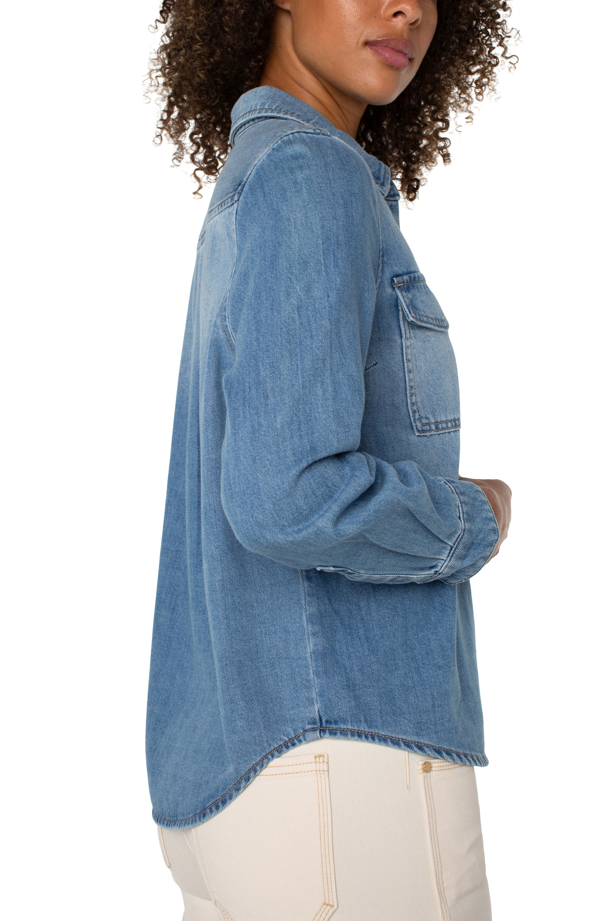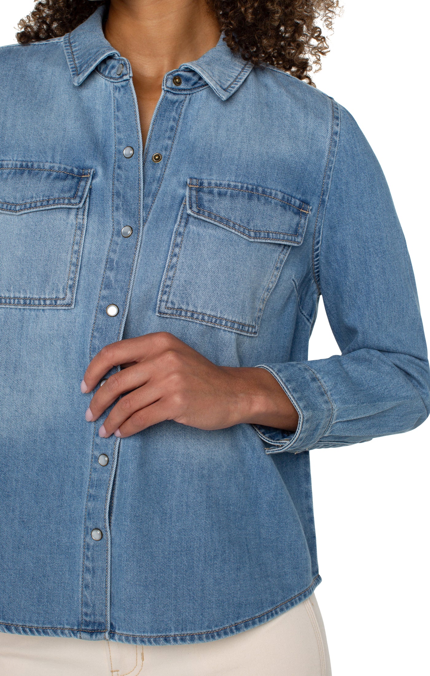 Our button-down denim shirt features pearlescent buttons making it an easy-to-wear piece that can be easily dressed up or down!